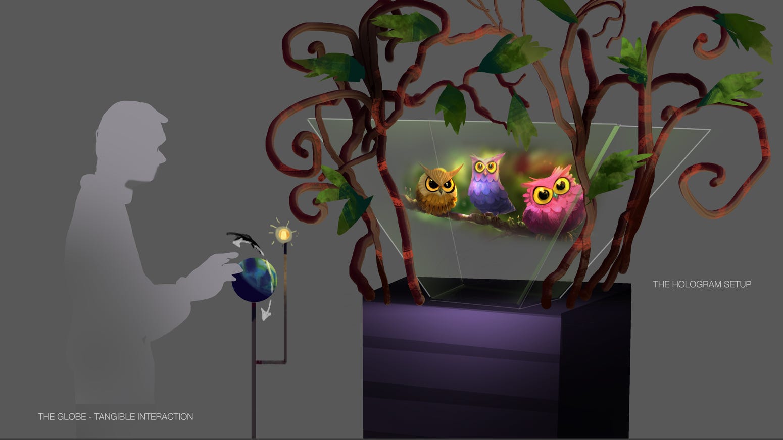Being in the domain of tangible interaction, the user interacts with a physical globe, lit by a light source (the sun). And then, based on the touch and rotational gestures on the globe, the owl changes behaviour. In the process, the user interacts with the owl, understanding its behaviour revolving around its sleep cycle.