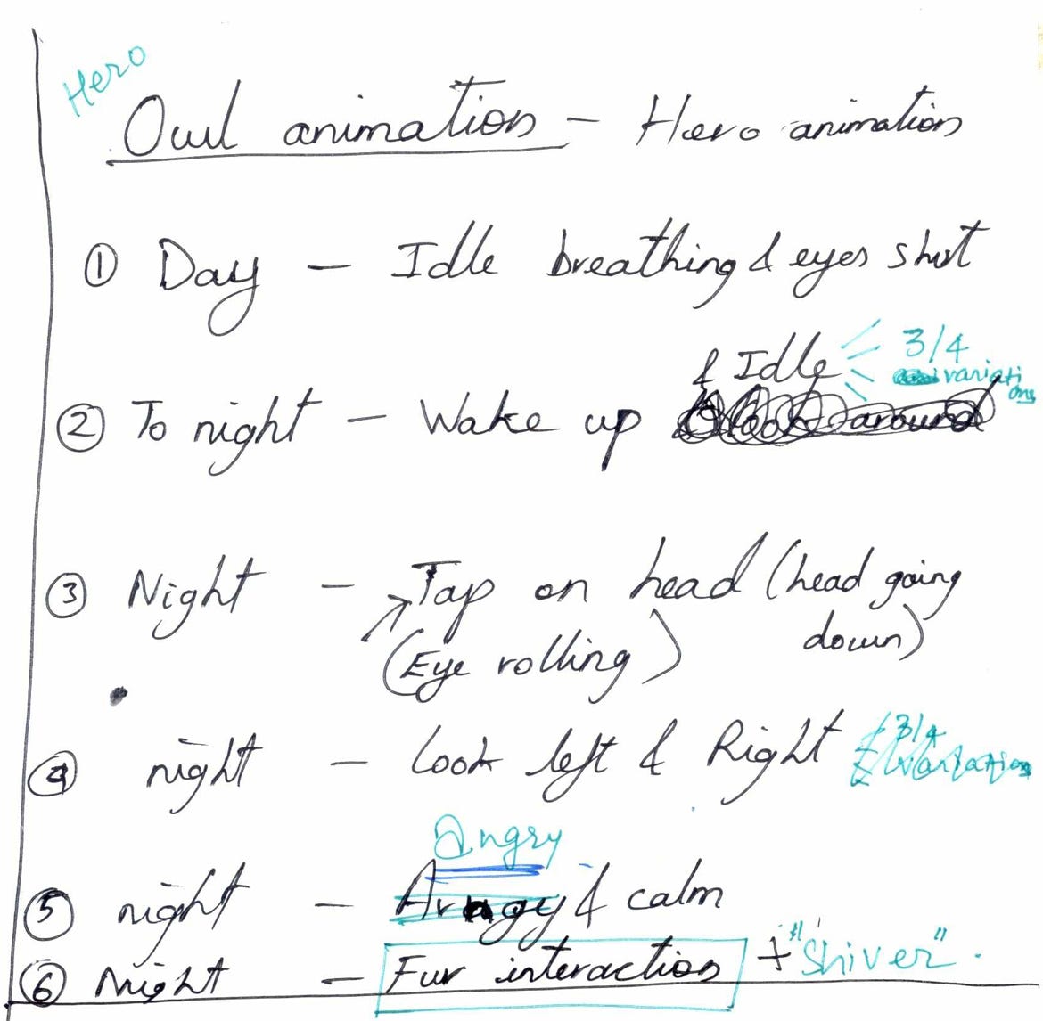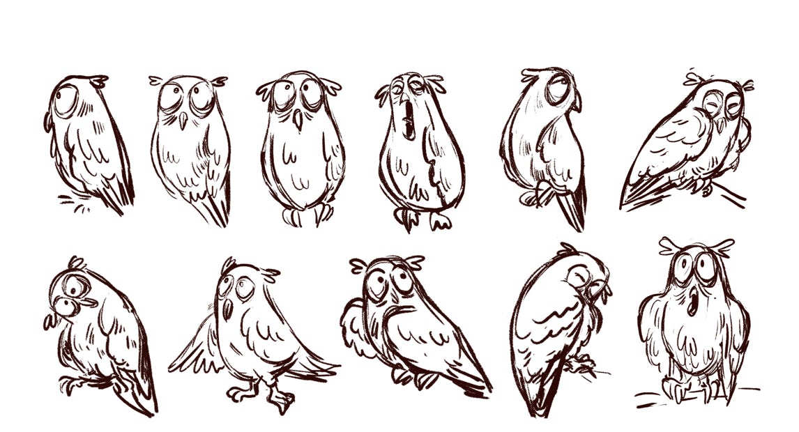 Study material about owl behaviour during day and night mainly came from various videos from wildlife documentaries. We also watched references of owls from various animated cartoons for stylisation.