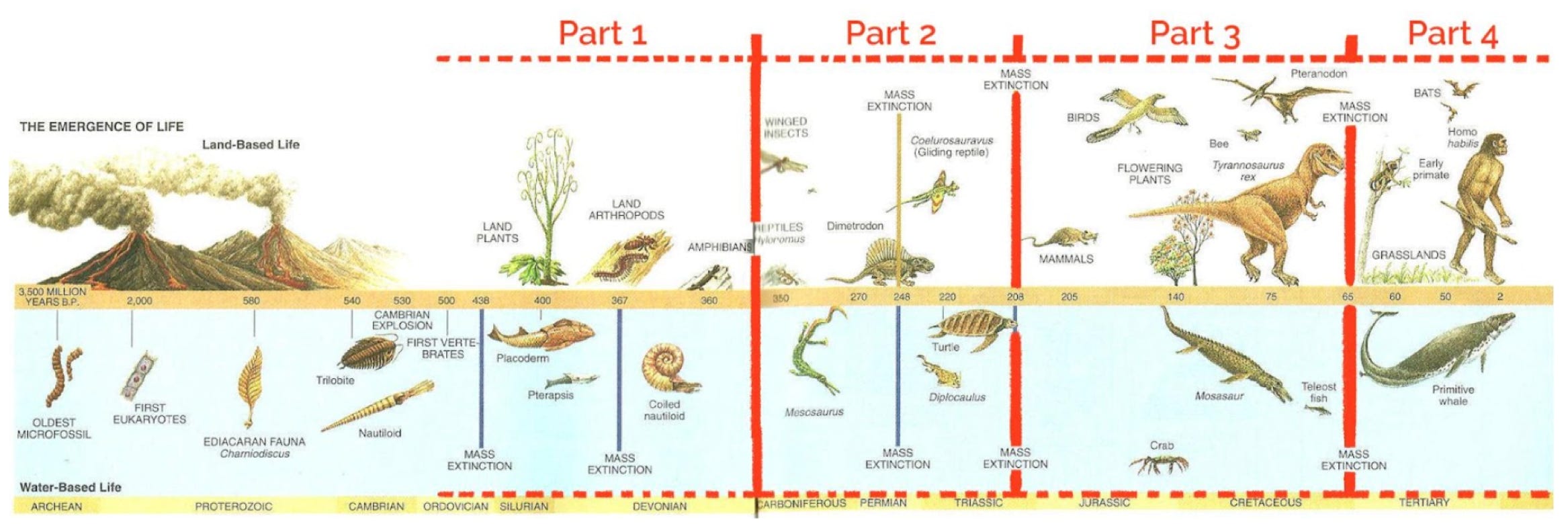 Next step was to divide the evolution timeline into four significant time periods that represent apparent transformation of organisms from one era to the next.