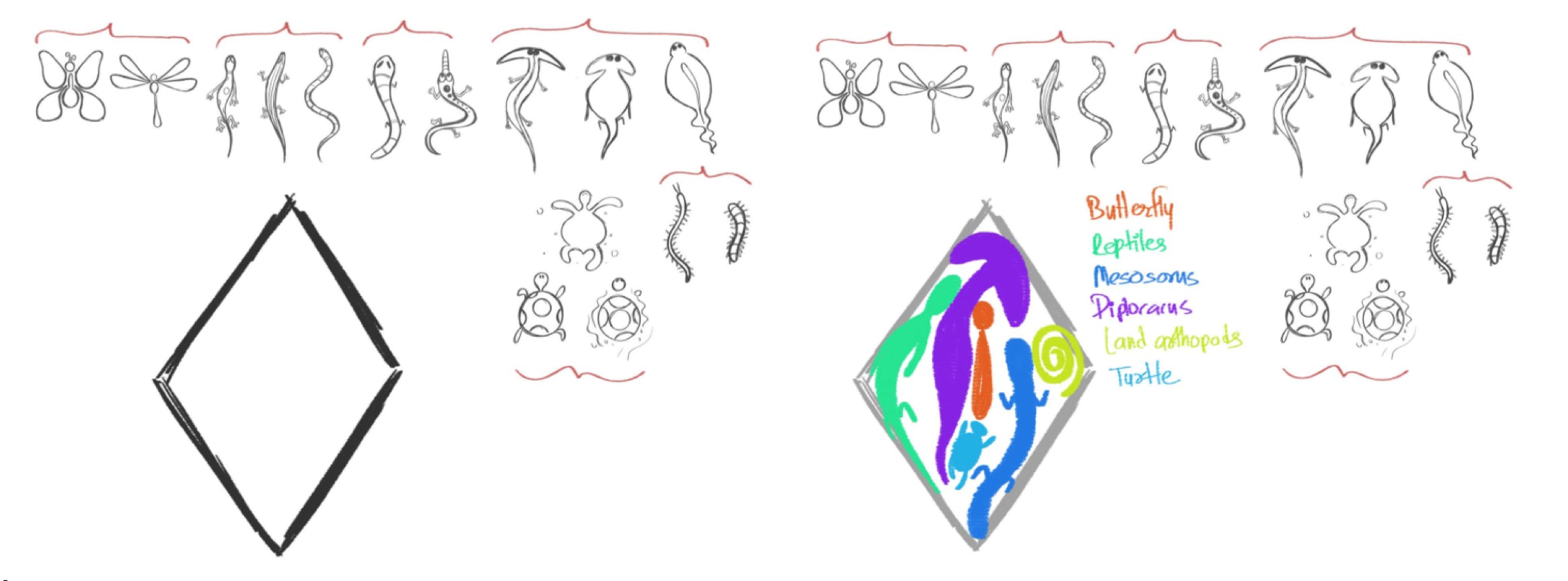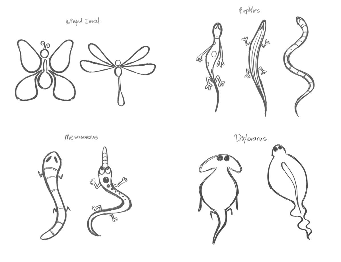 Our research on designing the tiles was intensive and precise towards the species that were selected, majorly understanding and visualising how they can be simplified in design and understanding their movement. Here are the various animal species selected for the selected eras: