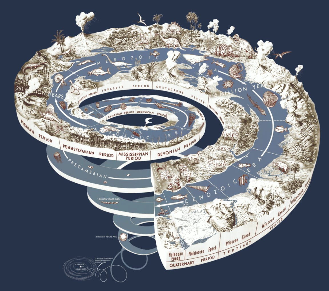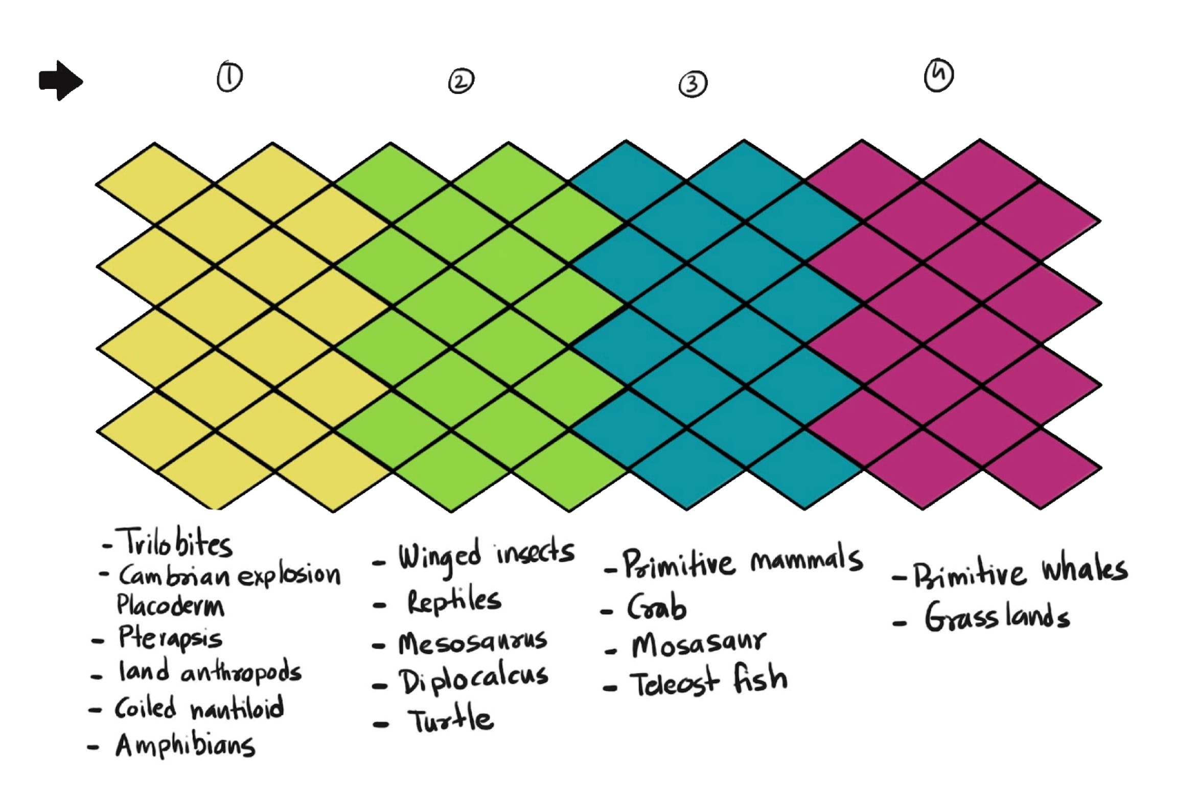 Chosen for each time period are four to five underwater organisms, such as the trilobite (Devonian), the reptile (Carboniferous), lobster (Jurassic), and the blue whale (Tertiary). Besides the ones mentioned above, the tiles when stamped will activate all the other chosen organisms from the installation.