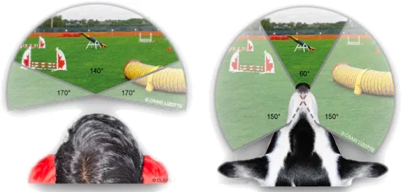 Dogs have eyes which are placed on the sides of the head, resulting in a visual field of 240 degrees compared with the human field of 200 degrees. The central, binocular field of vision in dogs is approximately half that possessed by humans. Dogs also tend to be nearsighted to varying degrees. Dogs typically have 20/75 vision. What this means is that they must be 20 feet from an object to see it as well as a human standing 75 feet away.